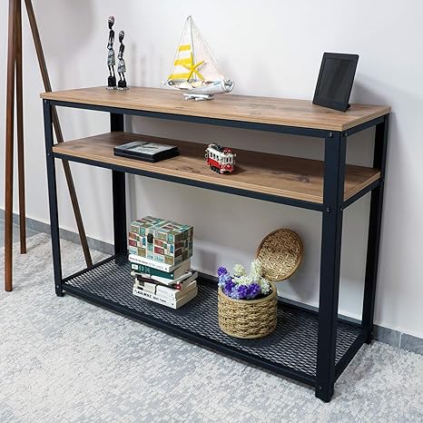 Benzara industrial console table with 2 shelves. Industrial style rustic solid wood and metal sofa table console table by crafters and weavers (1) $705 only 2 left saltoro sherpi iron framed console table with wooden top and wire mesh open by saltoro sherpi Create a warm welcome with the clean lines of this stylish entryway table which comes in a variety of colors and sizes. Warm up small spaces with the reclaimed look of burnt oak. When a console table with storage is topped with a pair of lamps and a mirror, your good taste is well reflected.